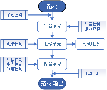 產品簡介: 由收放卷單元、電暈單元、臭氧還原單元、糾偏張力單元及控制單元等組成。